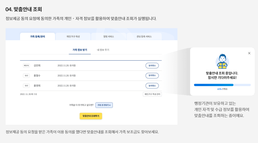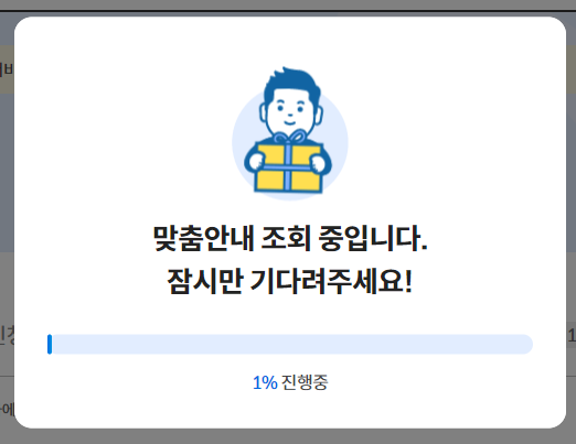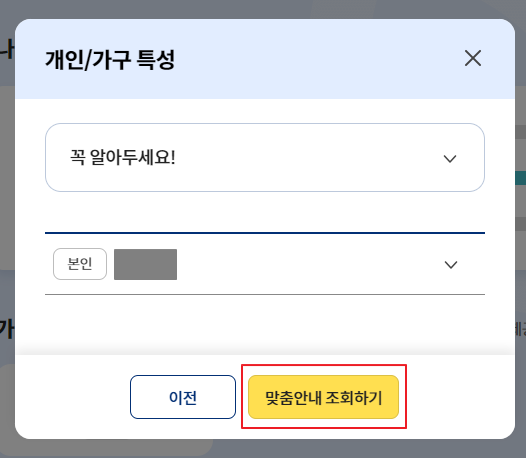 모든 동의를 완료하면 맞춤안내가 조회되고 진행됩니다.