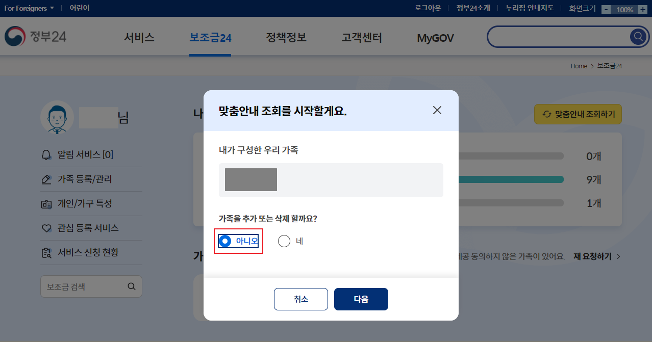 가족을 추가 또는 삭제할까요? 에서는 아니요를 누루고 다음을 눌러 진행해 줍니다.