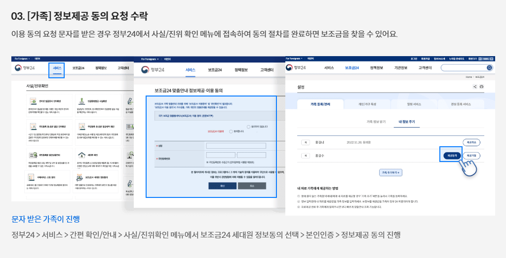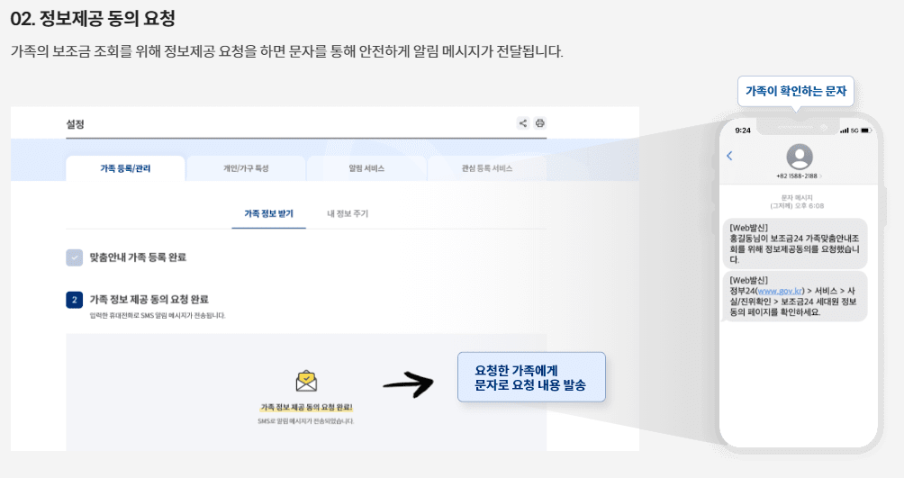 입력을 완료하면 정보를 입력한 가족 들어가 동의 문자가 발송됩니다.