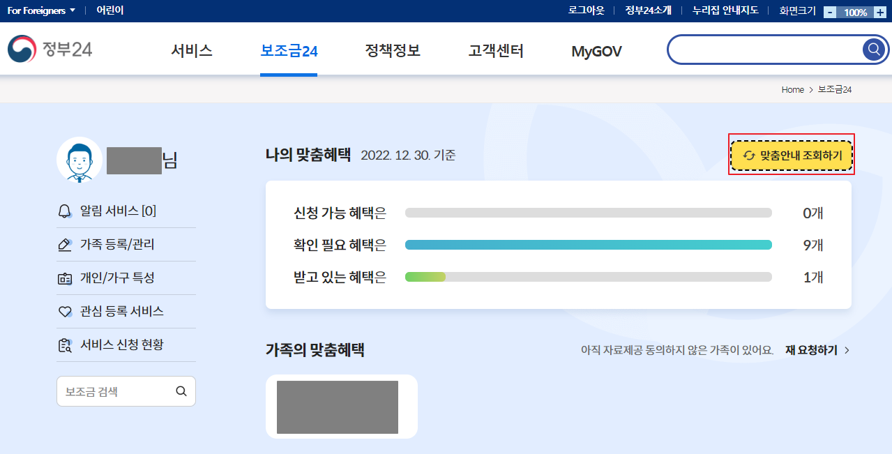 2. 타 지역에 사는 가족(부모님) 보조금 확인
