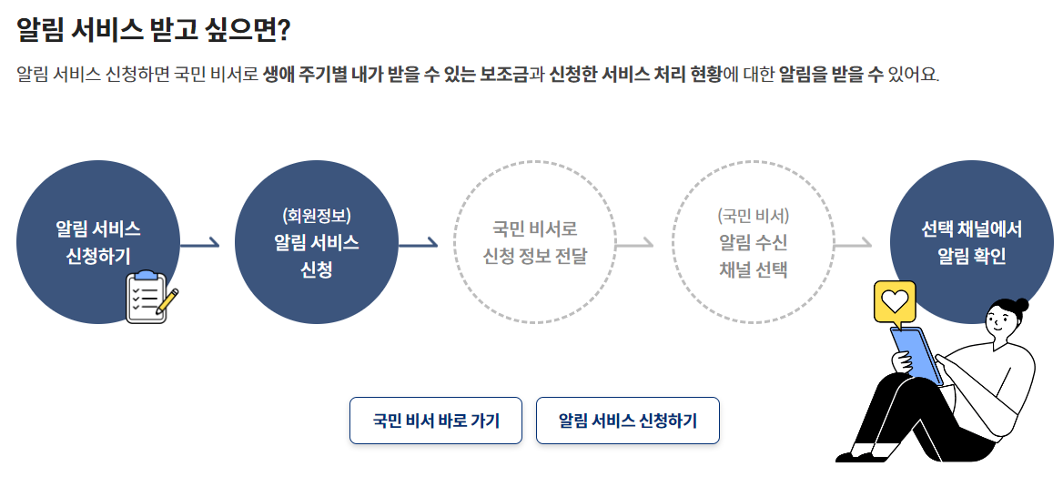 주기별 추가되는 보조금과 신청한 보조금에 대해서 진행사항을 확인할 수 있도록 알림을 보내드리는 서비스입니다.