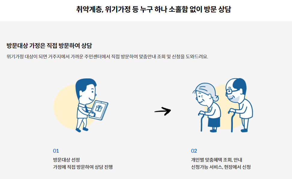 거동이 불편하시거나 취약계층을 위해 위기가정 대상자에게는 직접 찾아가 받을 수 있는 보조금 조회 및 신청도 도와준다고 합니다.