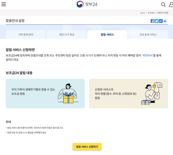 아래의 그림에 알람 서비스를 클릭하여 진해하시면 간편하게 신청하실 수 있습니다.