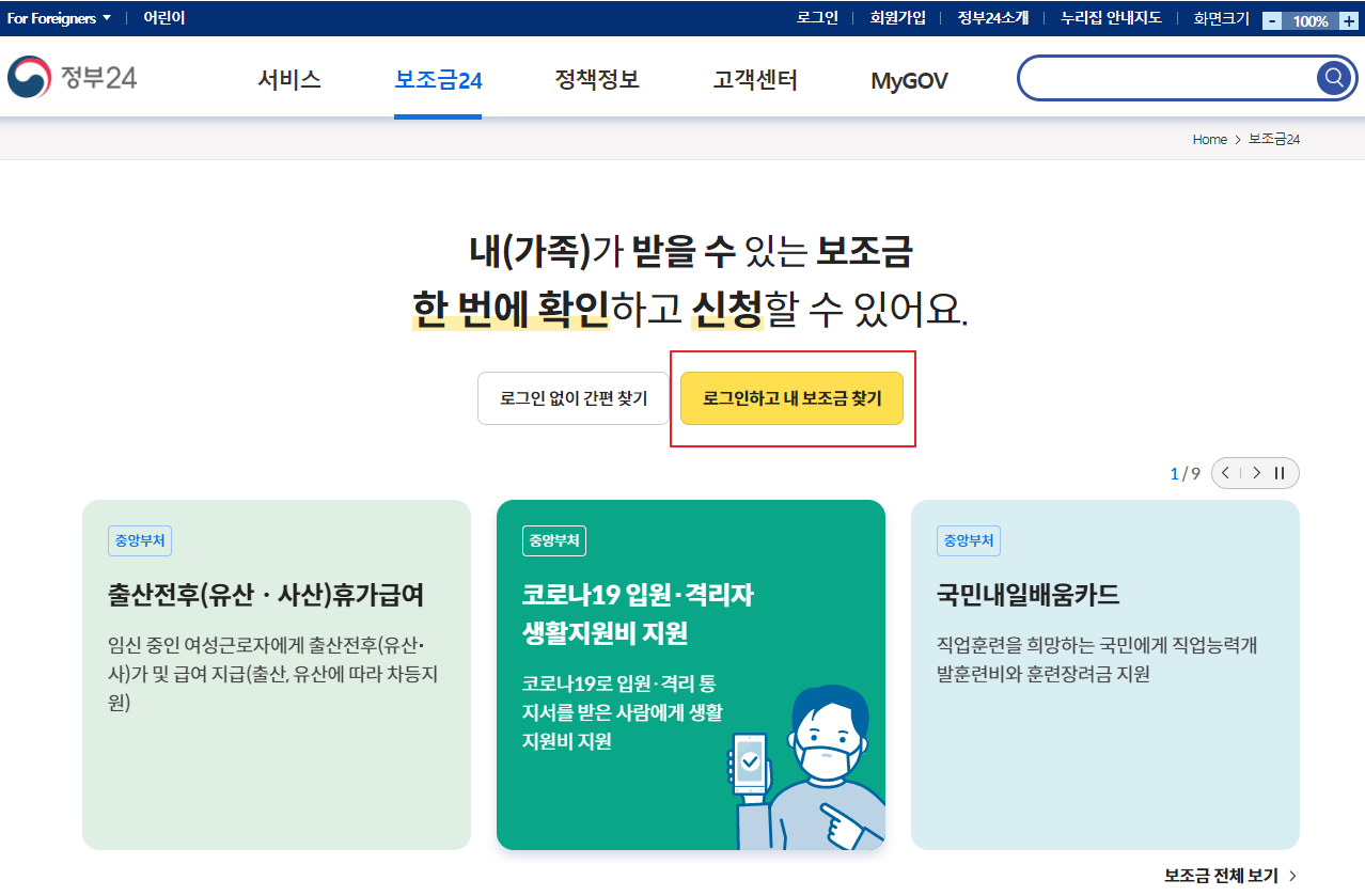 로그인 후 확인 하는 법이 가장 간단하니 로그인하고 내 보조금 찾기를 눌러주시기 바랍니다.