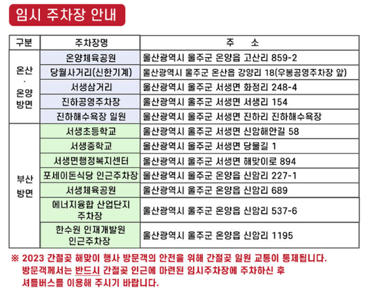 방문 시에는 교통이 통제된다고 하니 주변에 마련된 임시주차장에 주차를 하고 셔틀버스를 이용해야 합니다.